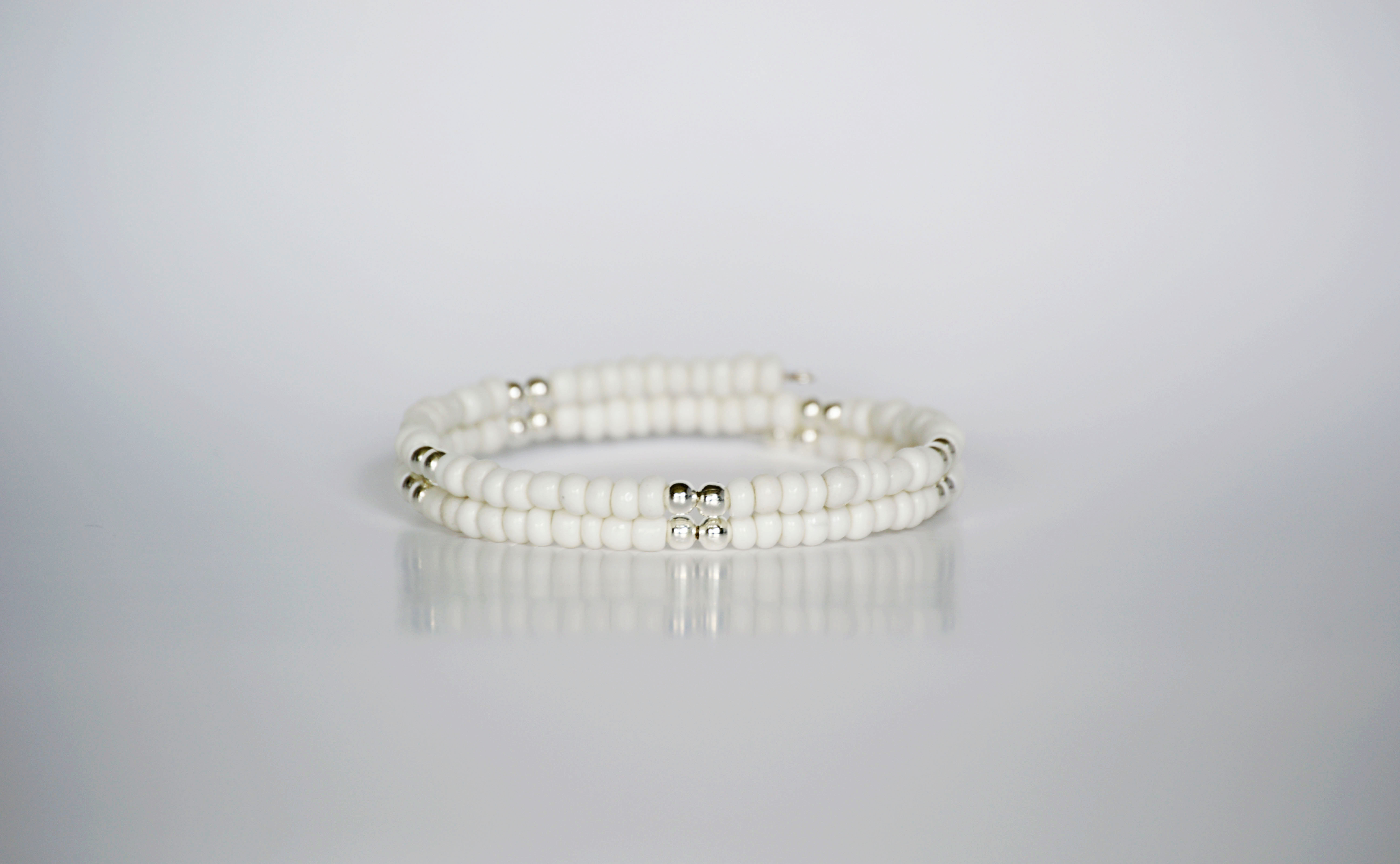 This lovely bracelet is perfect for any outfit! It has white seed beads and silver beads. The diameter of this bracelet is approximately 2.25". Although this may seem small, the bracelet can stretch and still keep its round shape due to the memory wire.
