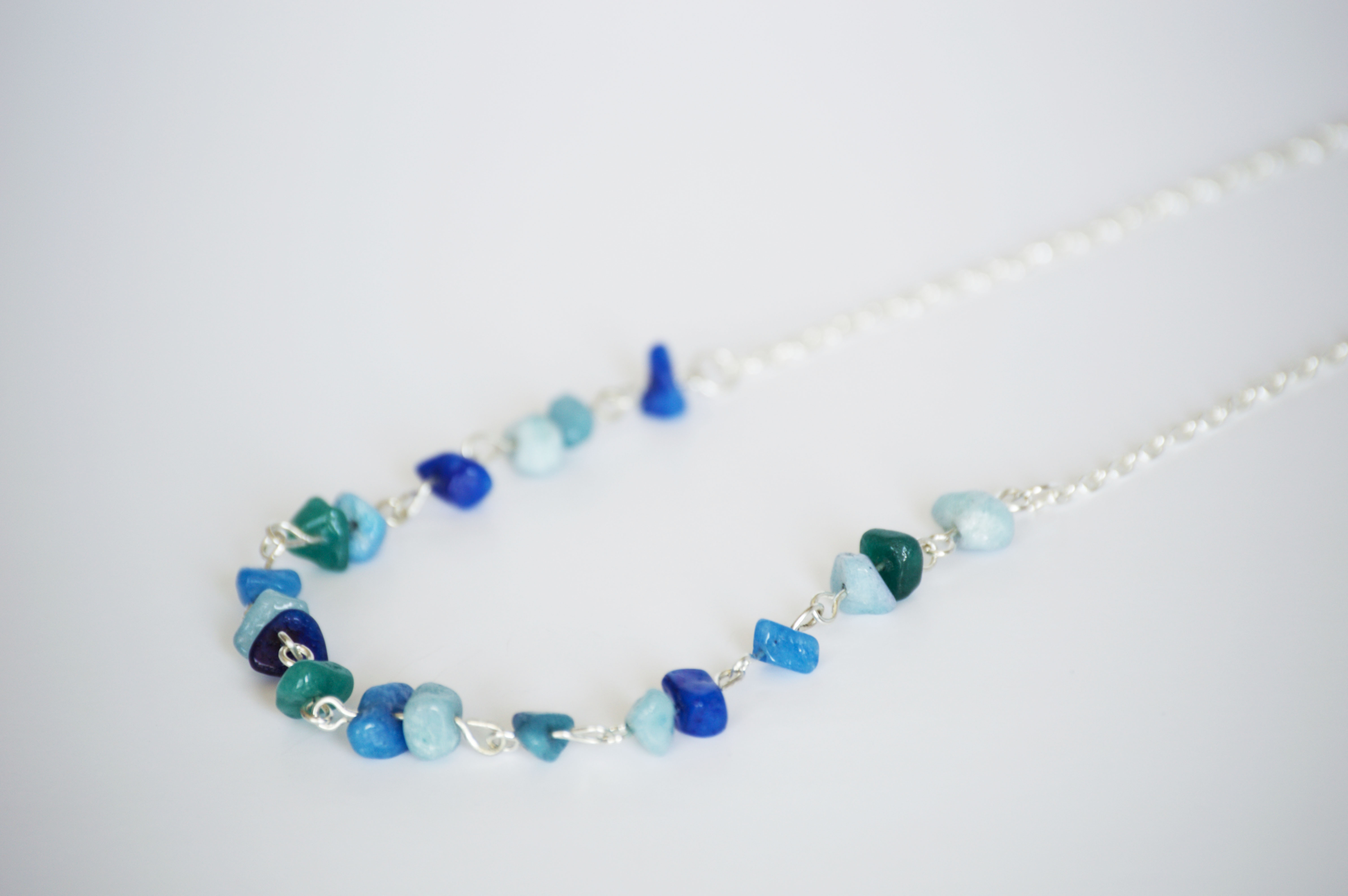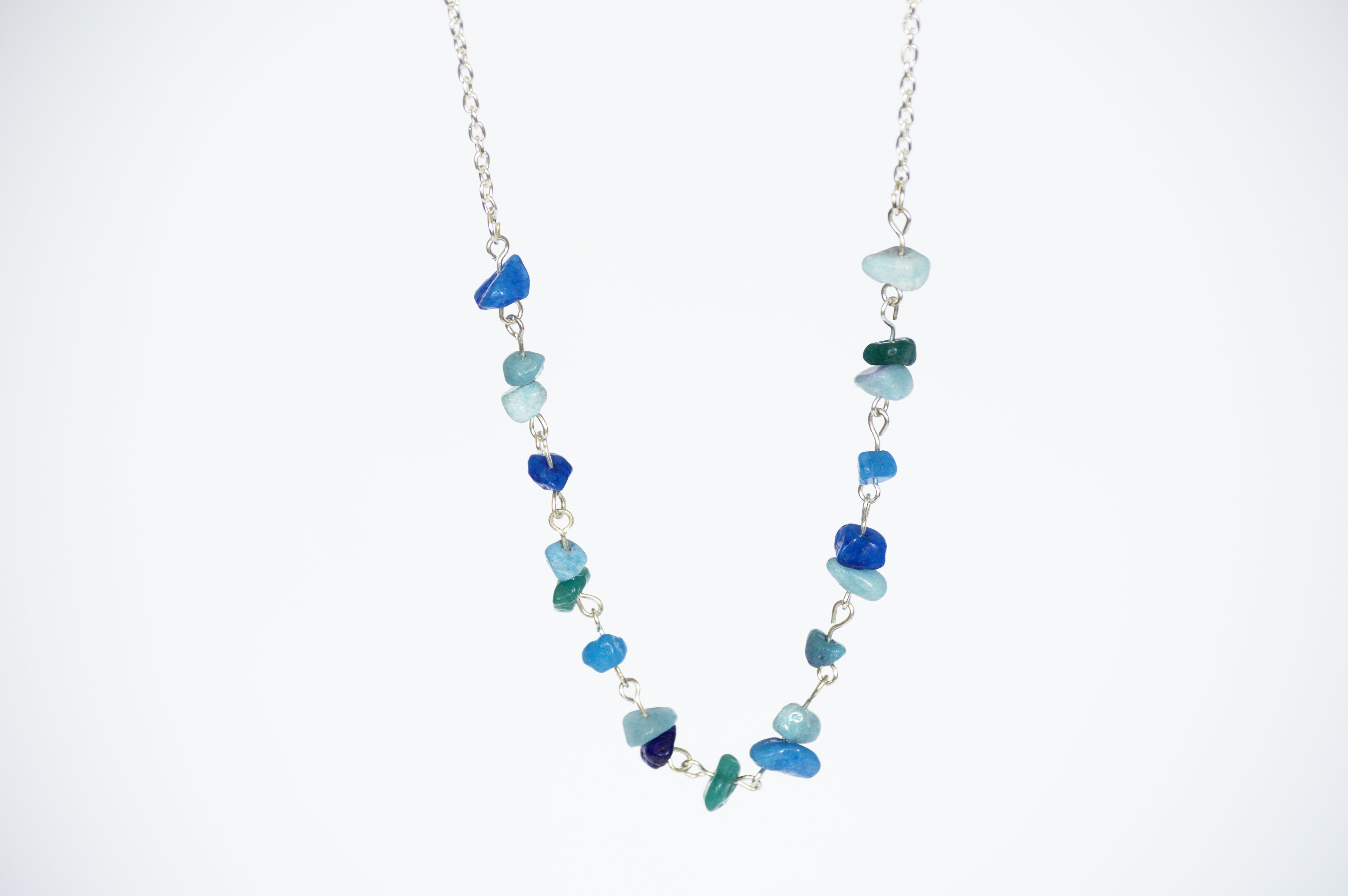 This gorgeous necklace is one of my favorites! It has 19 aqua mix quartz chips on handcrafted links. Each link is made with silver plated wire and they are attached to fine cable chain. This necklace ends with a lobster clasp and is approximately 23" long.