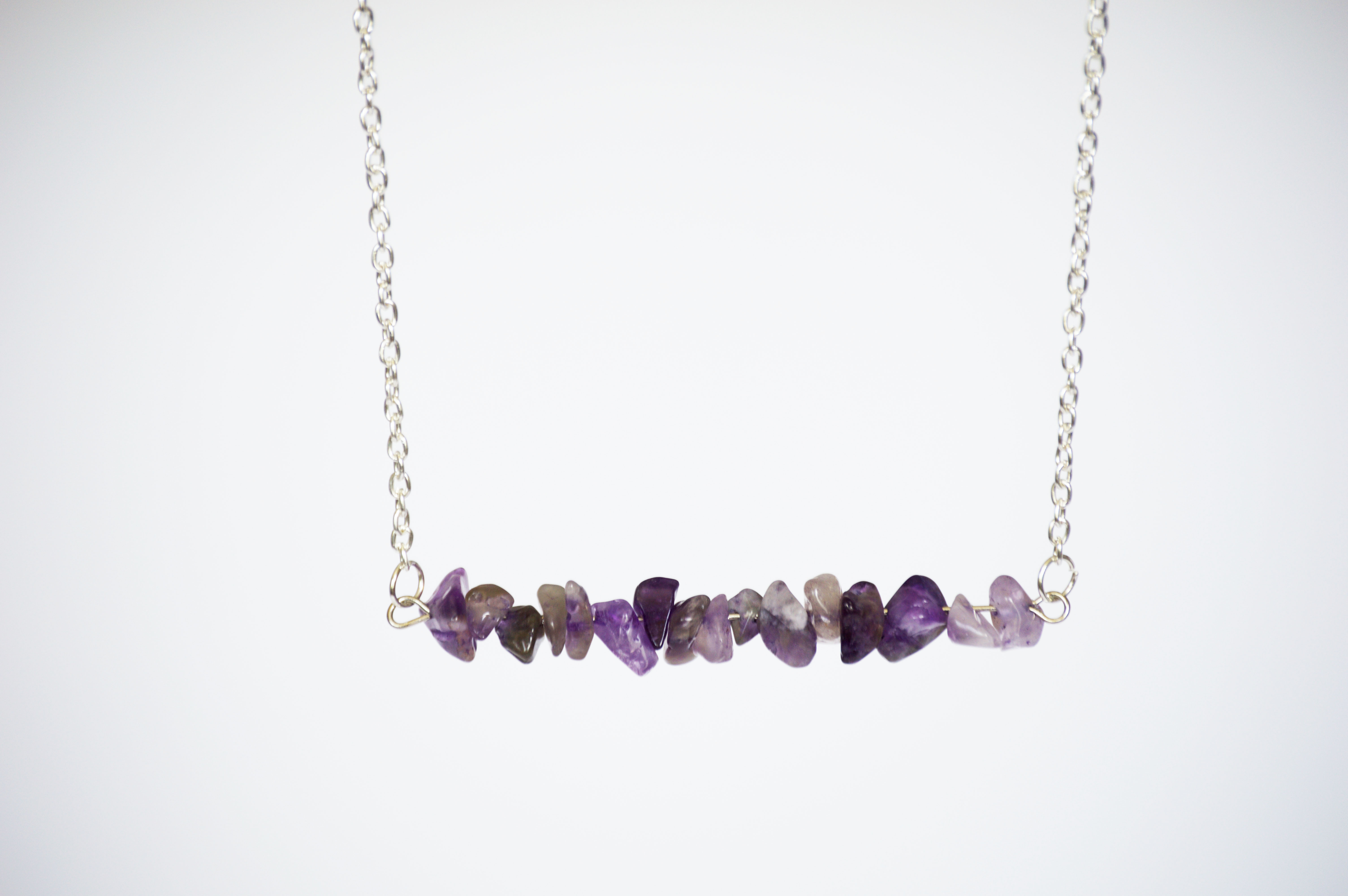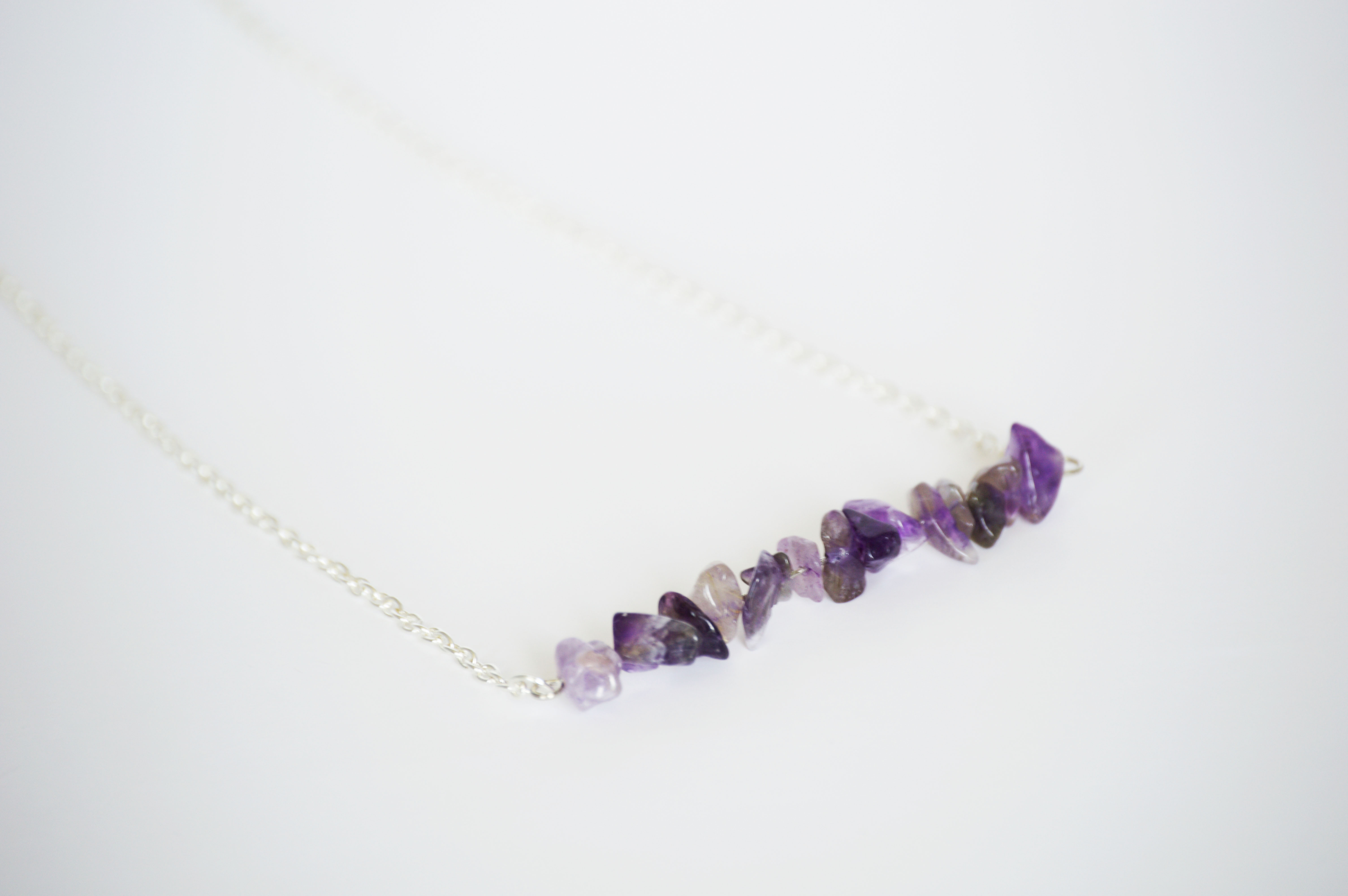 This beautiful necklace is made with 16 amethyst chips on silver plated wire. The wire is attached to fine cable chain and ends with a lobster clasp. The length of this necklace is approximately 20".