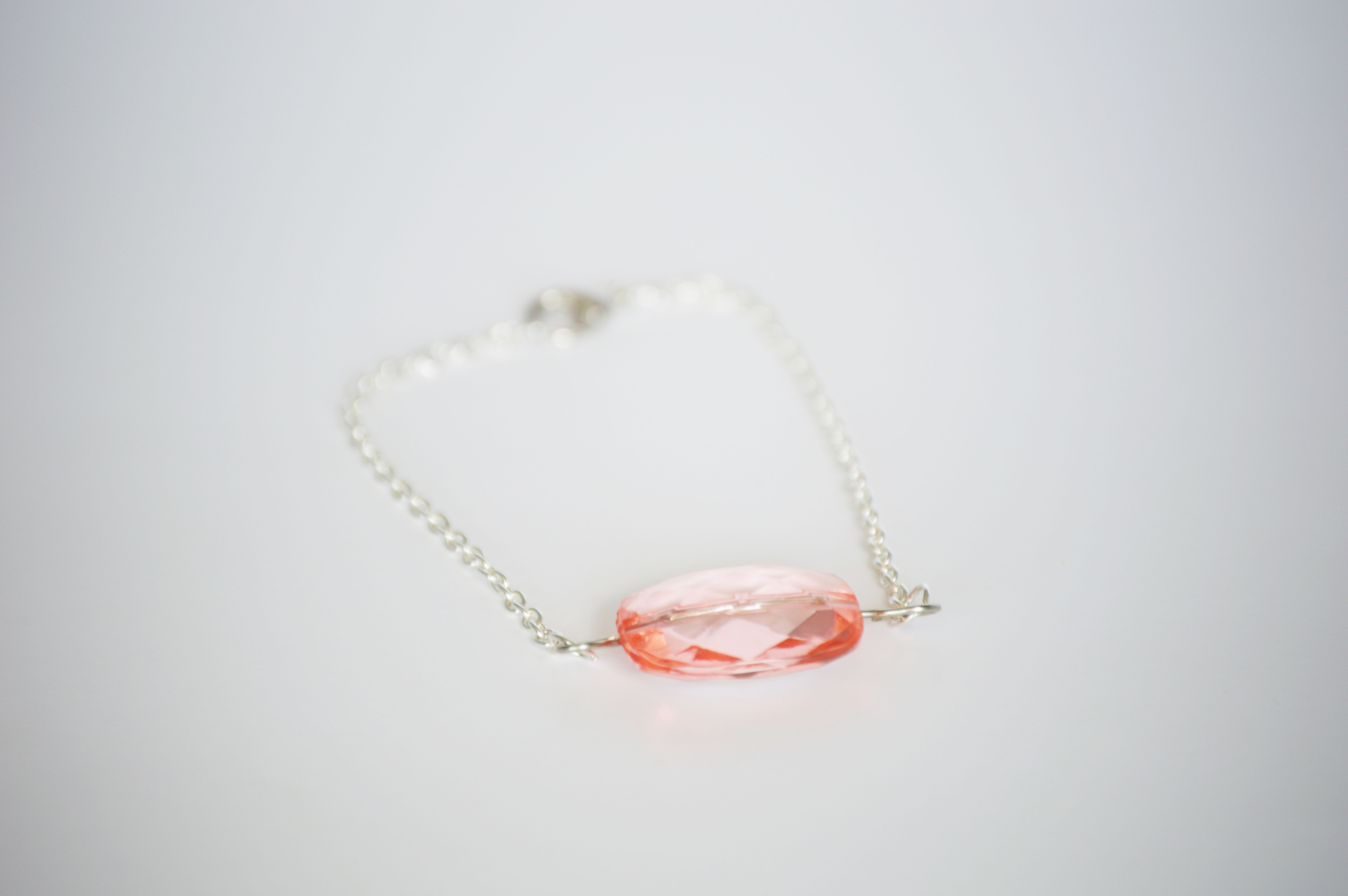 This lovely bracelet is the perfect piece to brighten up an outfit! It is made with one peach bead on silver plated wire. The wire is attached to fine cable chain ending with a lobster clasp. The length of this bracelet is approximately 8.5"