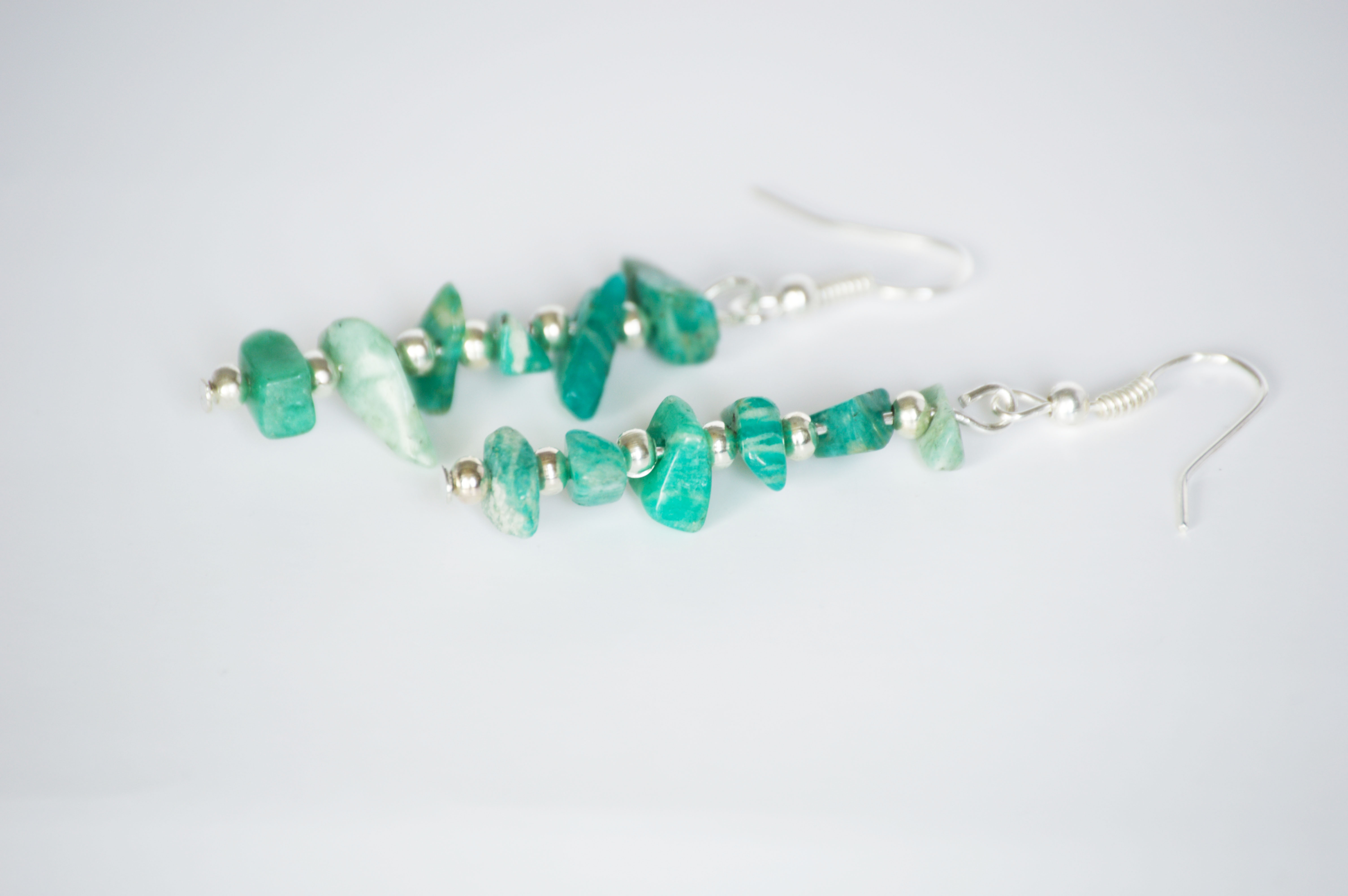 These lovely earrings are perfect for any occasion. They each have six amazonite chips and six silver beads. These earrings hang at approximately 1.5".