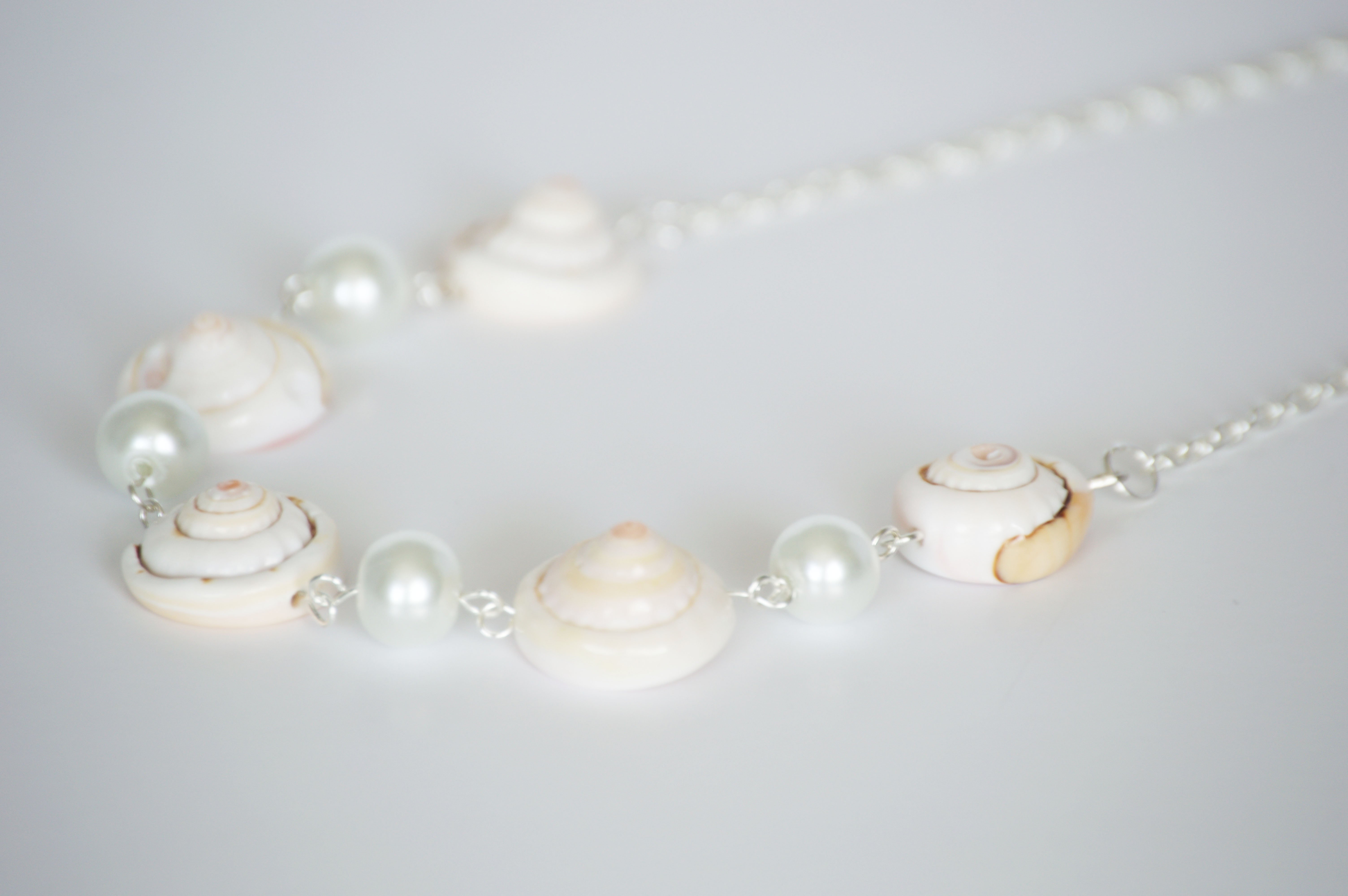 This lovely necklace is the perfect accessory for any outfit. It has five shell beads and four glass pearls on handcrafted links. They are attached to fine cable chain that ends with a lobster clasp. This necklace is approximately 18.75" long.