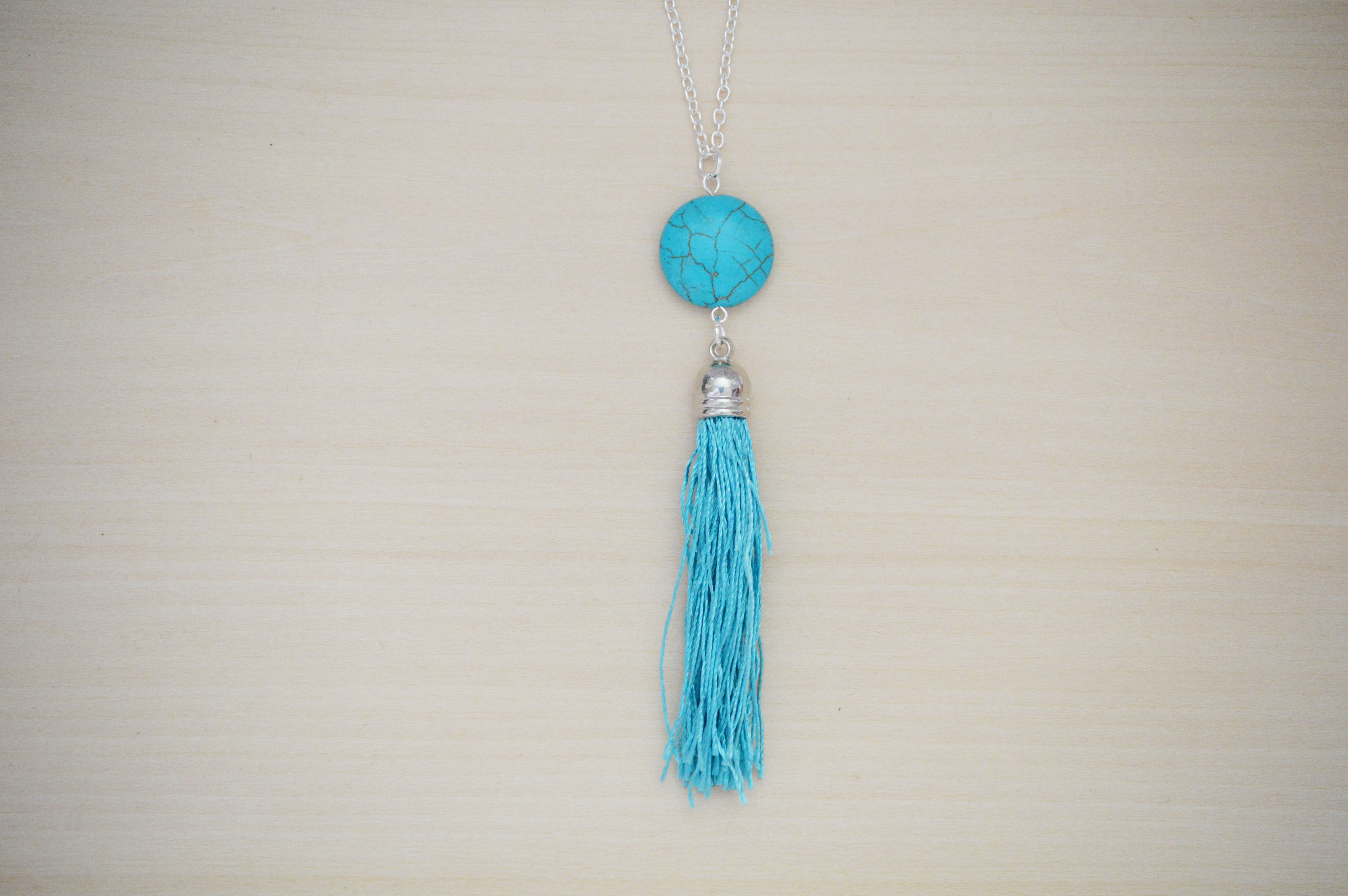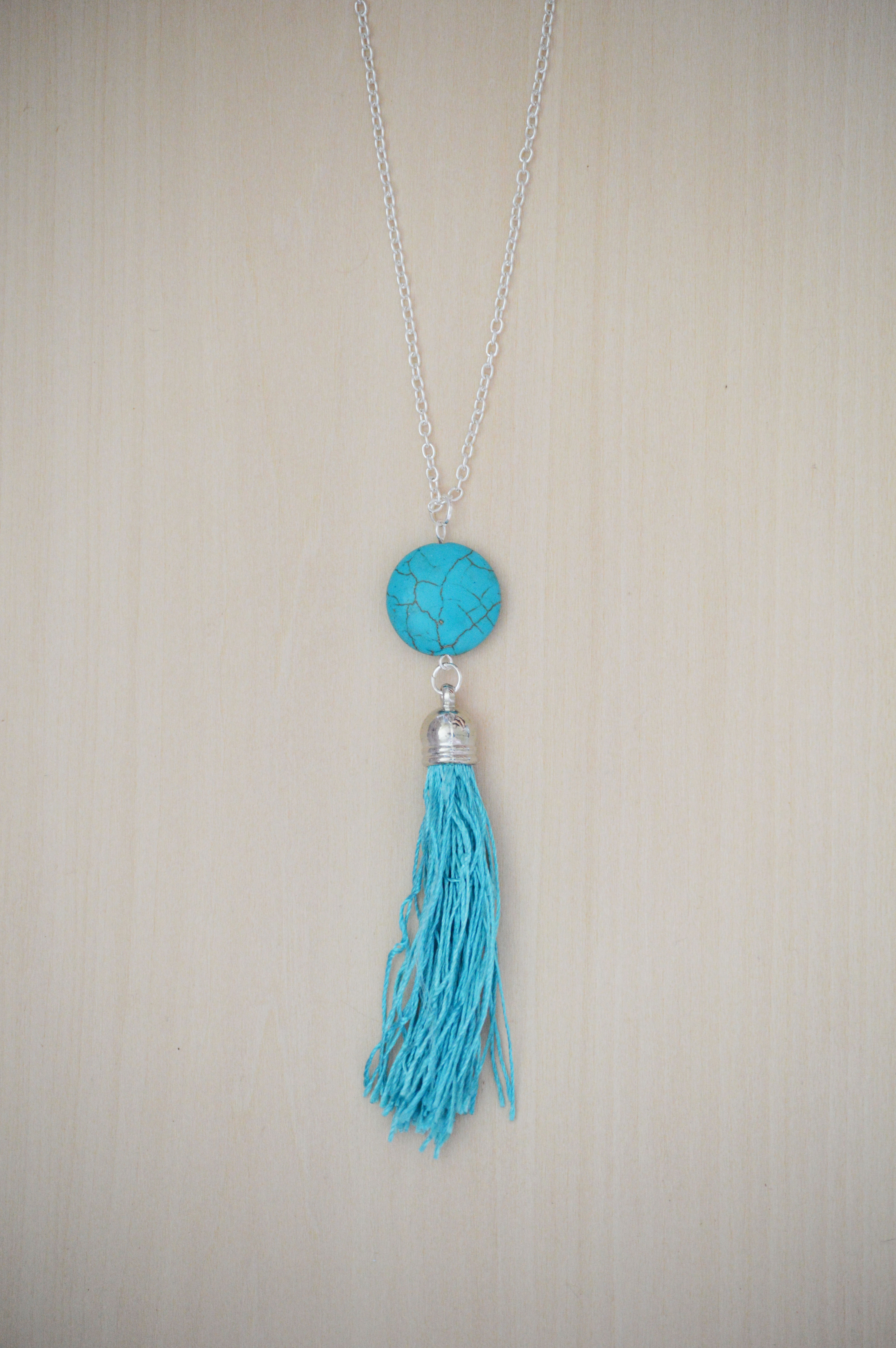 This lovely necklace is the perfect accessory to add a pop of color to any outfit! It has one round turquoise colored bead and one turquoise silk tassel. This necklace is on a fine cable chain and ends with a lobster clasp. The length of this necklace is approximately 25” and the pendant hangs at approximately 4.5”.