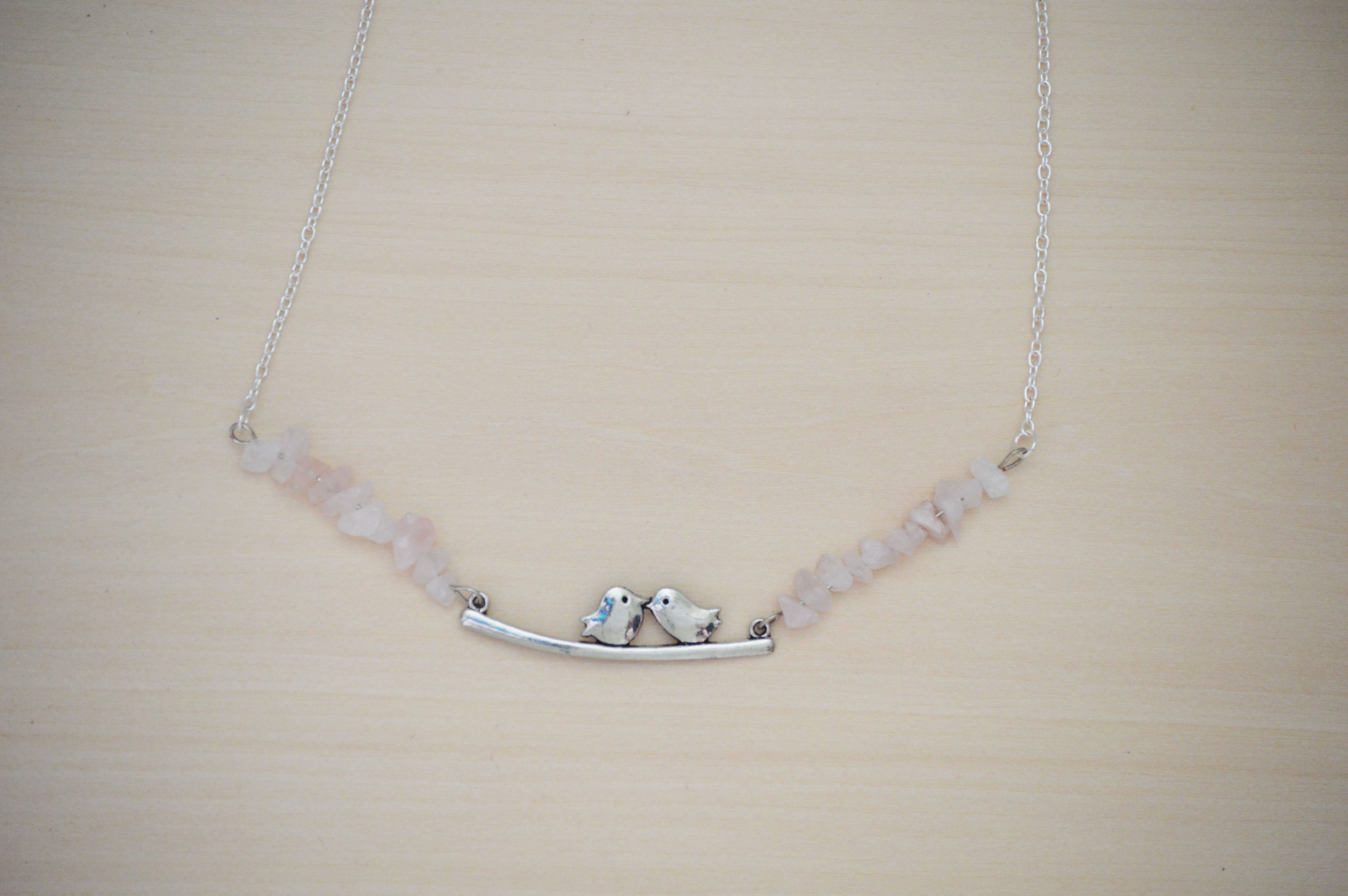 This lovely necklace is the perfect accessory to add a pop of color to any outfit! It has rose quartz chips and one antique silver lovebirds pendant. This necklace is on a fine cable chain and ends with a lobster clasp. The length of this necklace is approximately 23”.