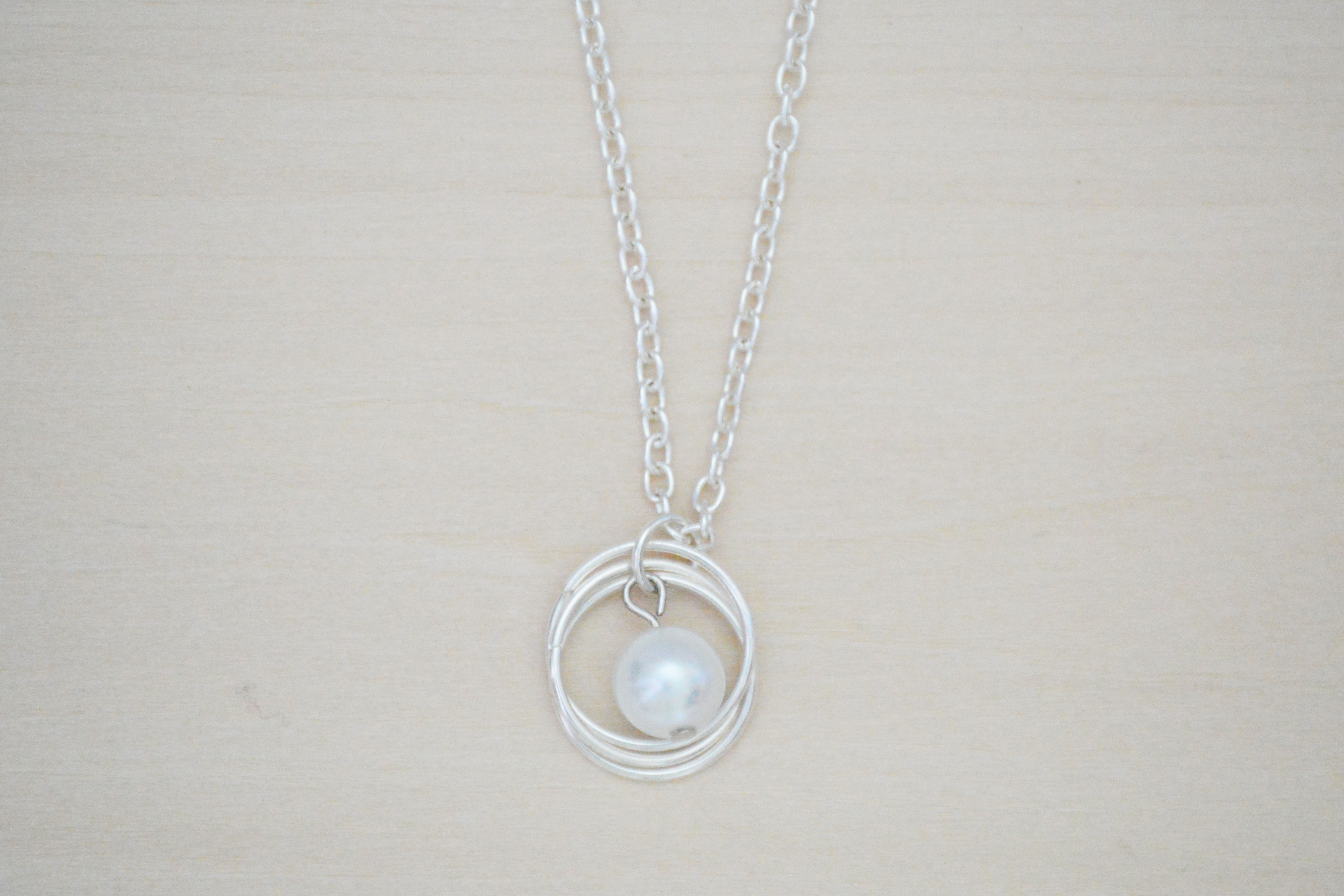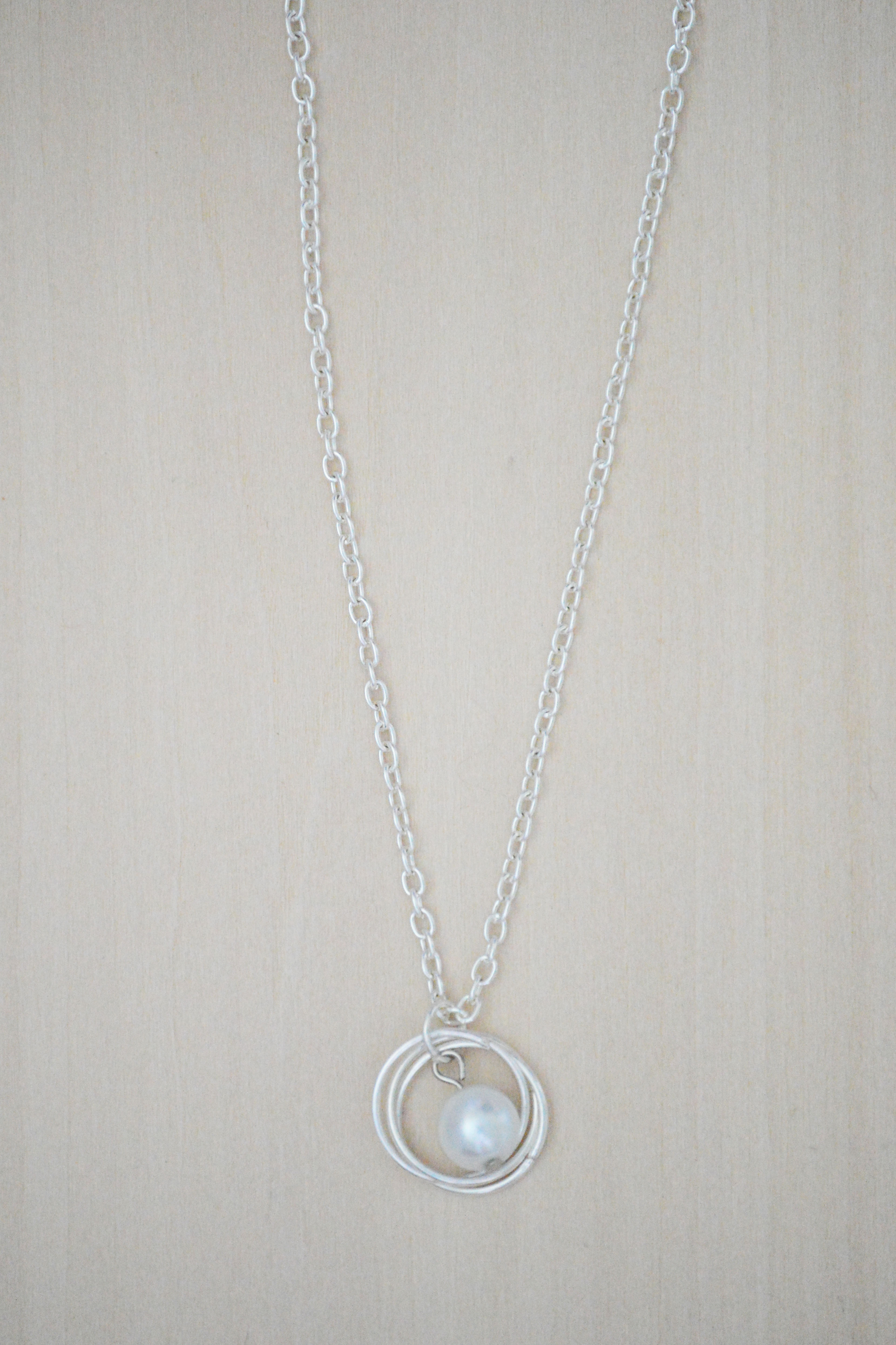 This lovely necklace is perfect for layering. It has one white glass pearl on silver plated wire. This necklace is on a fine cable chain and ends with a lobster clasp. The length of this necklace is approximately 19”.