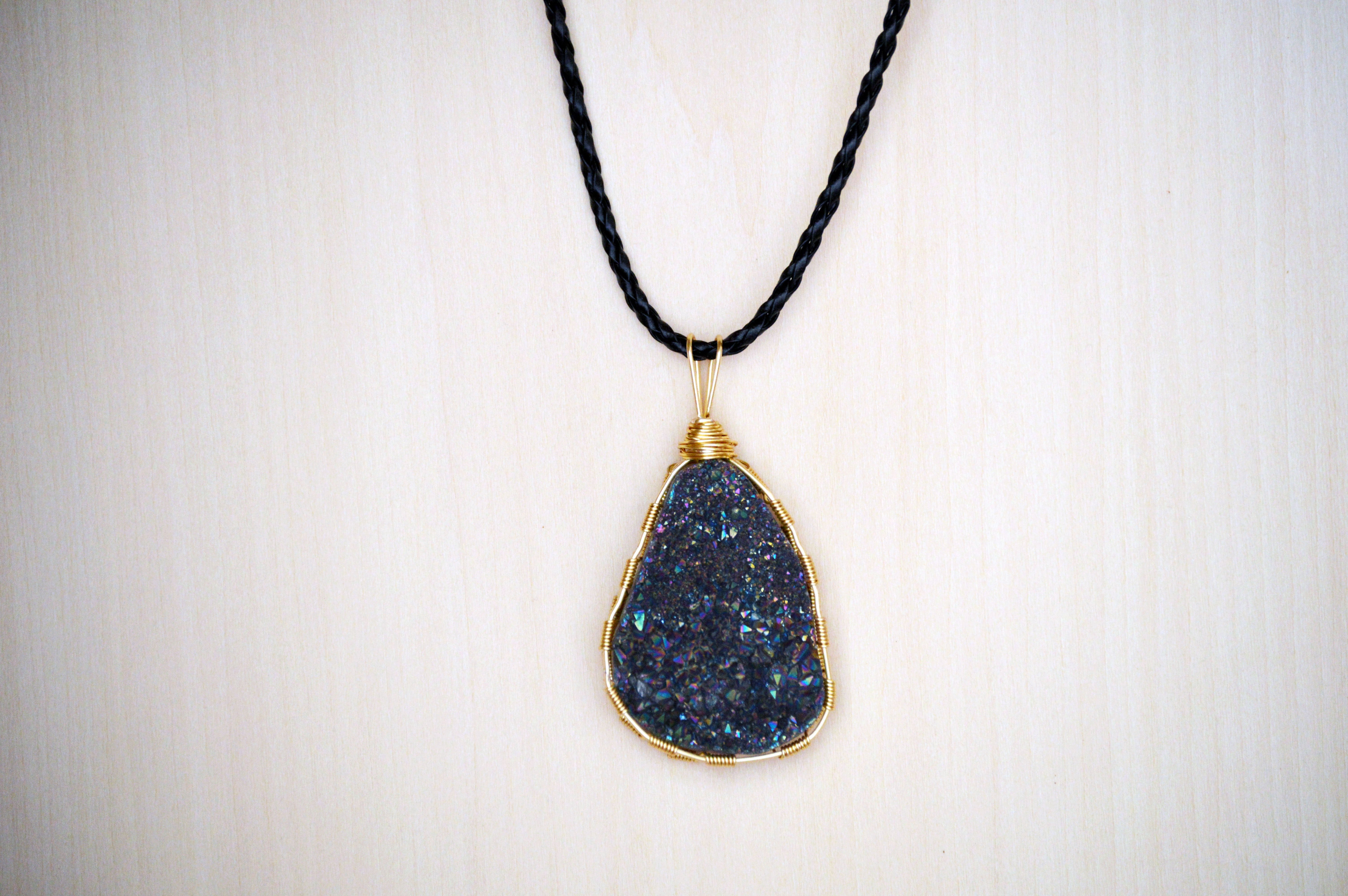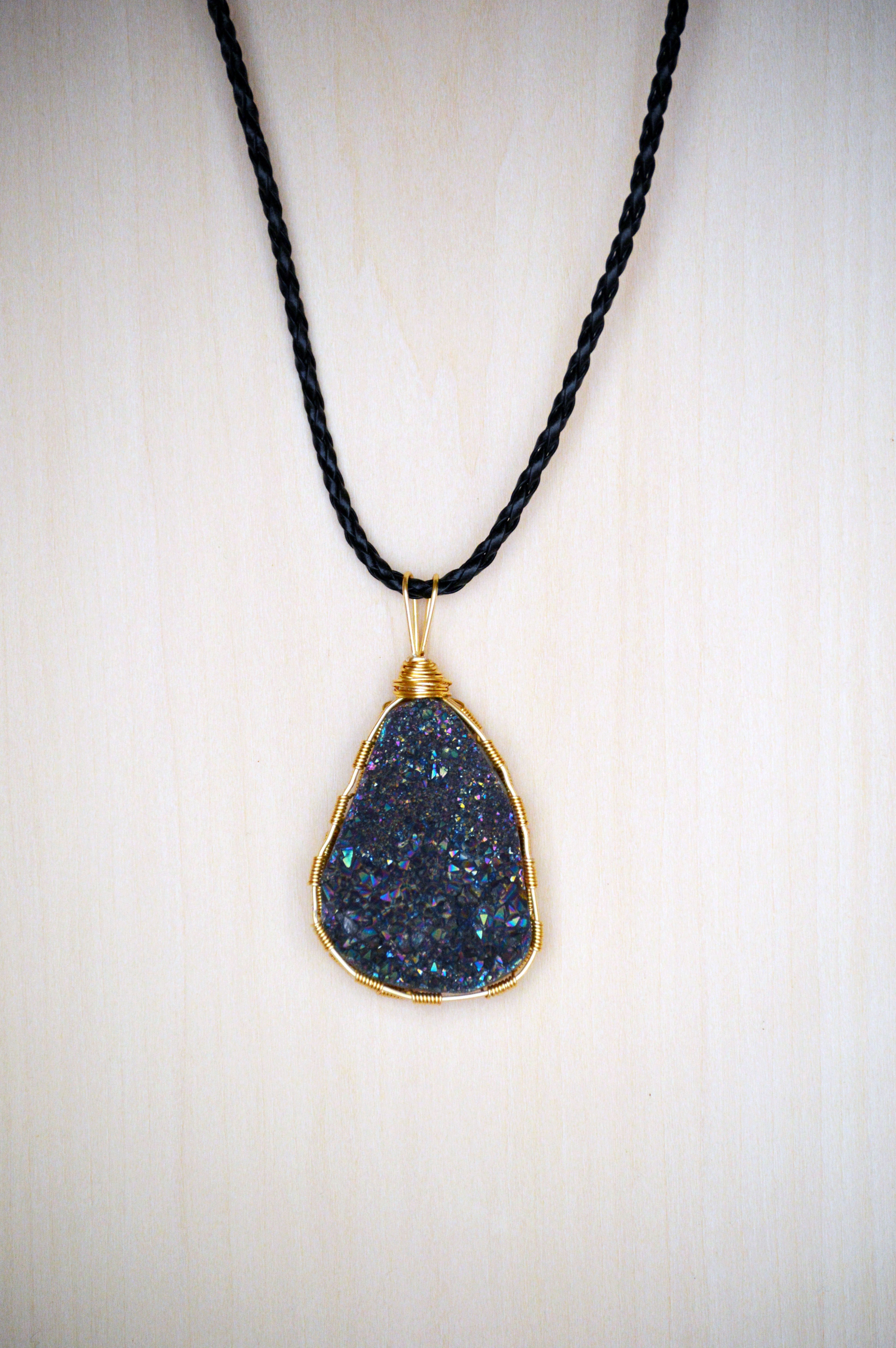 This gorgeous necklace is perfect for any outfit. It has one large titanium druzy agate wrapped in gold plated wire. This necklace is on a braided leather necklace. The necklace is approximately 18" long and the pendant measures at 2.5”.