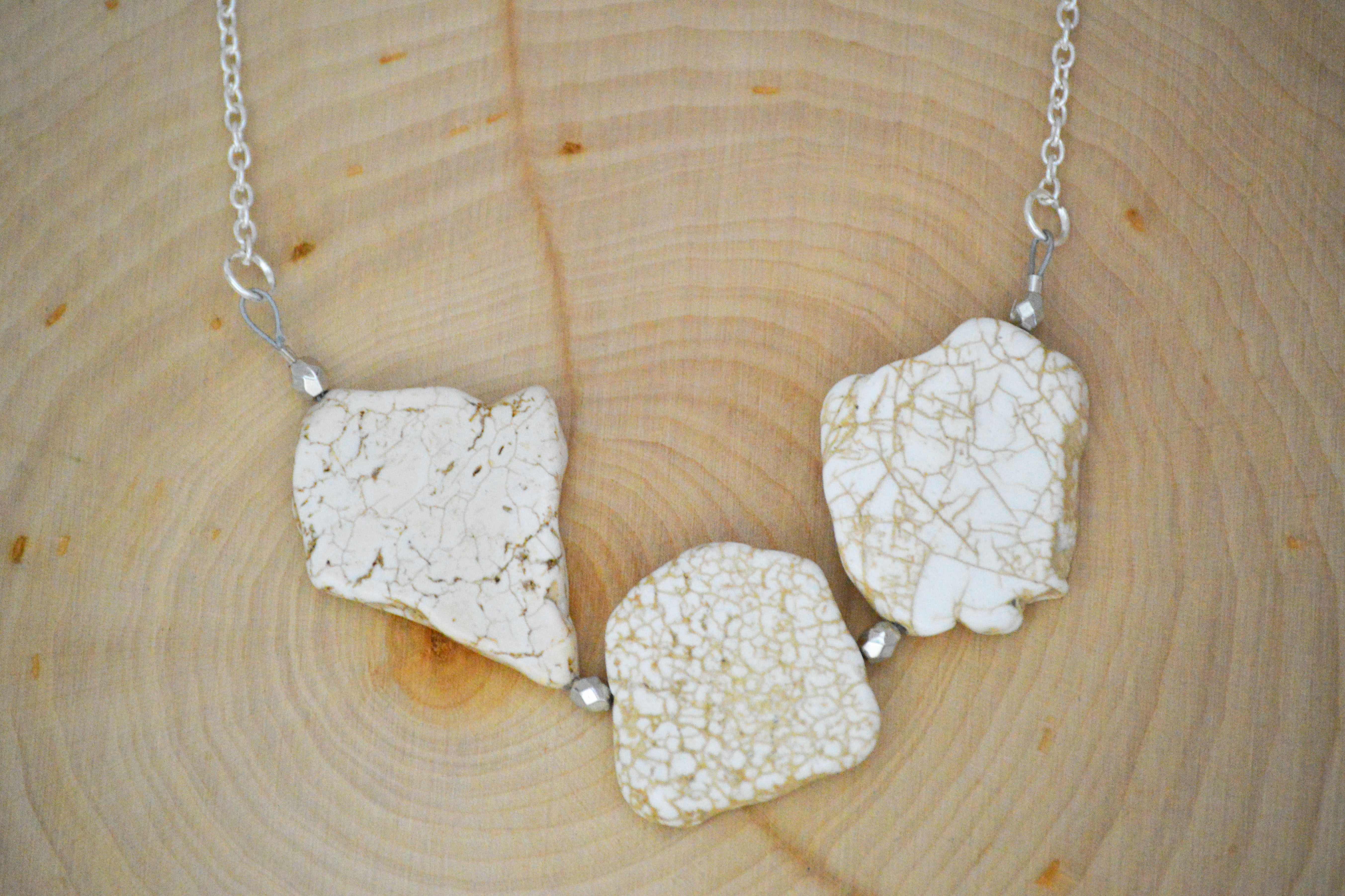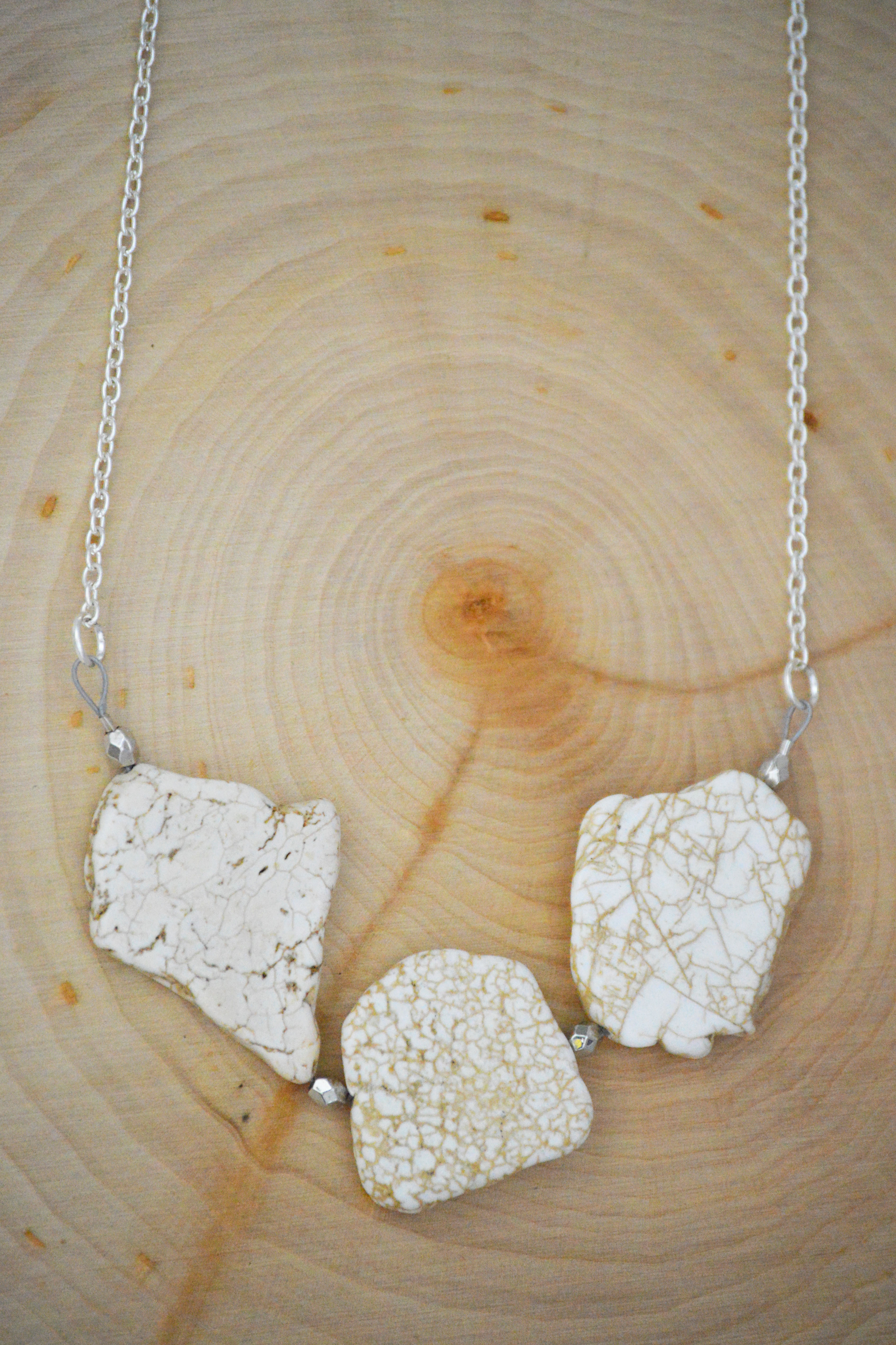 This gorgeous necklace is the perfect accessory for any outfit. It has three Howlite beads on fine cable chain. This necklace is approximately 22" long”.