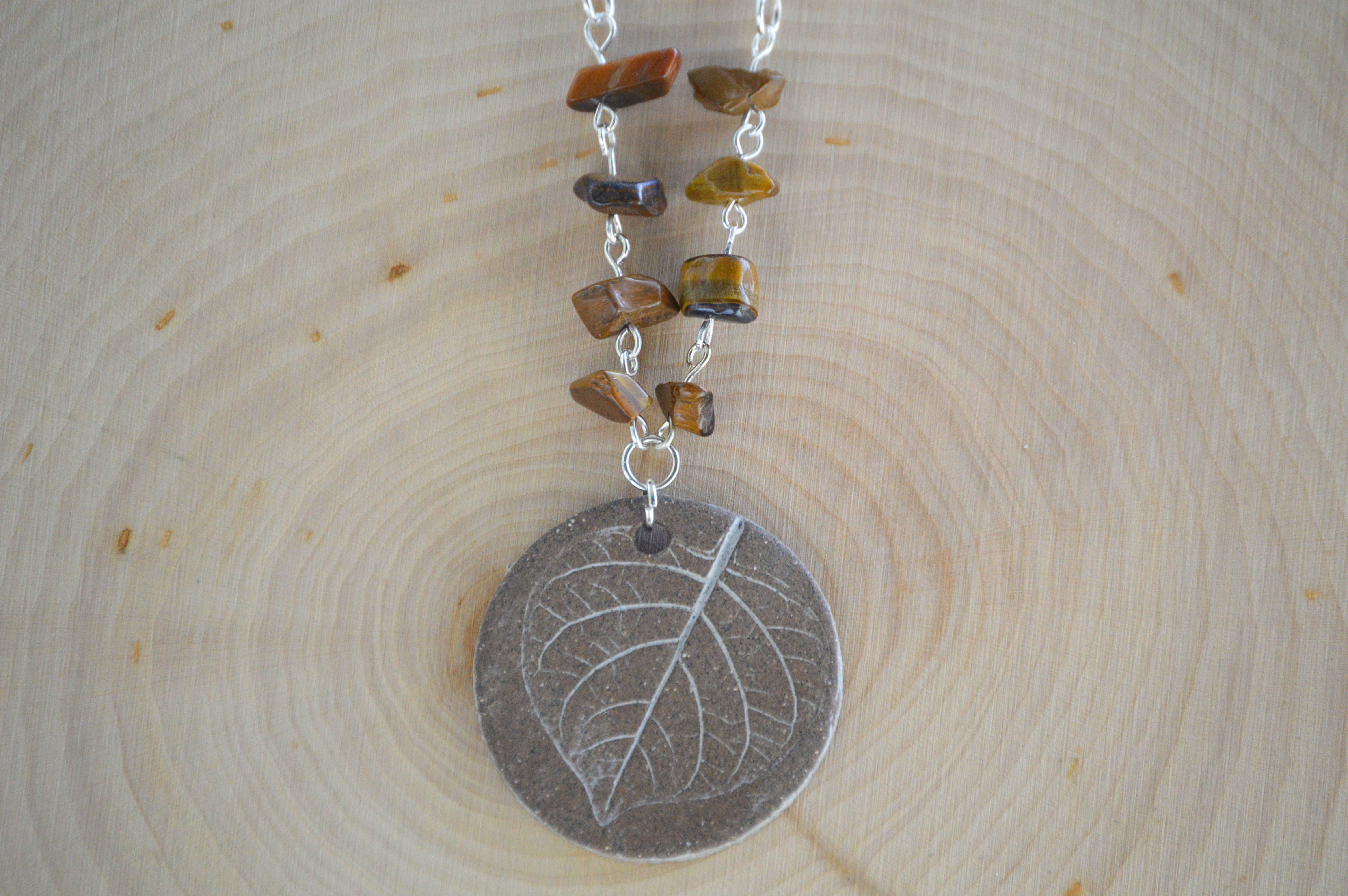 This gorgeous necklace is the perfect accessory for any outfit. It has one clay leaf pendant attached to a hand linked gemstone chip chain. The gemstones in this necklace are tiger’s eye. This necklace is on a fine cable chain and it is approximately 22” long with a 1.5” pendant.